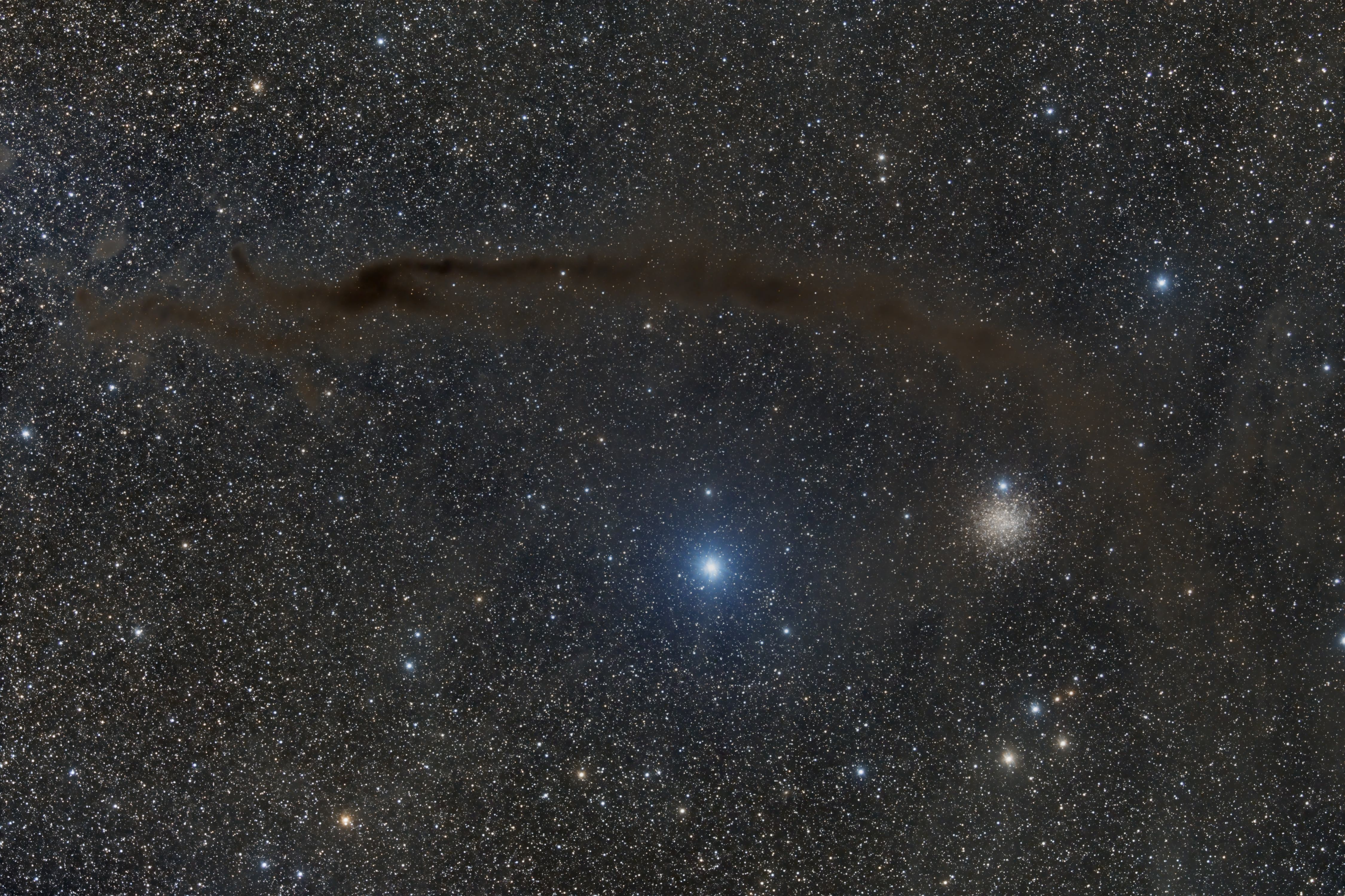 The Dark Doodad Nebula is a dark nebula near the globular cluster NGC 4372, much closer than the centerof the galaxy and in the galactic plane, having a length of nearly three degrees of arc. Although officially unnamed, this long molecular cloud has come to be known under this name. It can be found in the southern constellation of Musca (the Fly) with strong binoculars.
