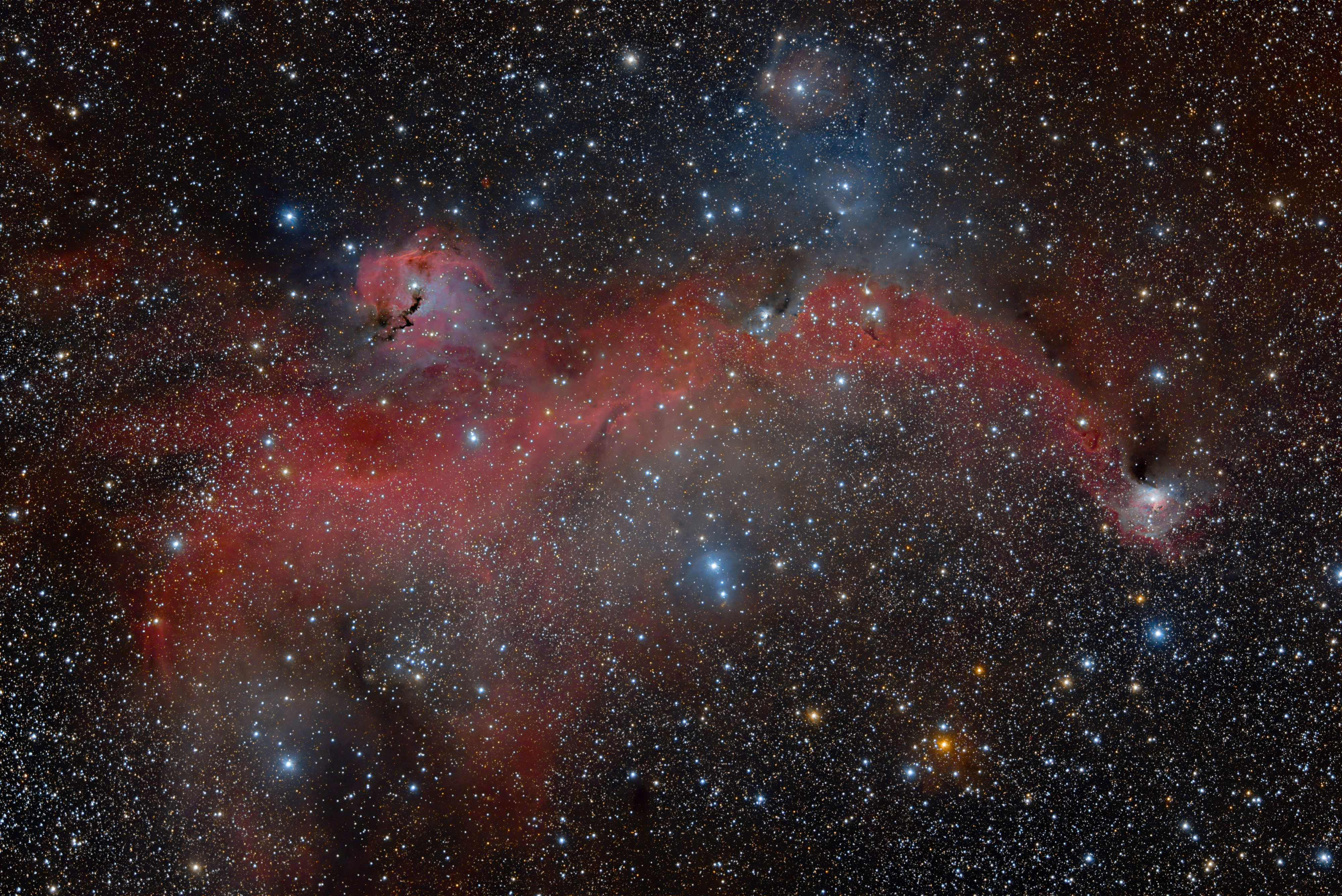 The name Seagull Nebula is sometimes applied by amateur astronomers to this emission region, although it more properly includes the neighboring regions of star clusters, dust clouds and reflection nebulae. This latter region includes the open clusters NGC 2335 and NGC 2343.